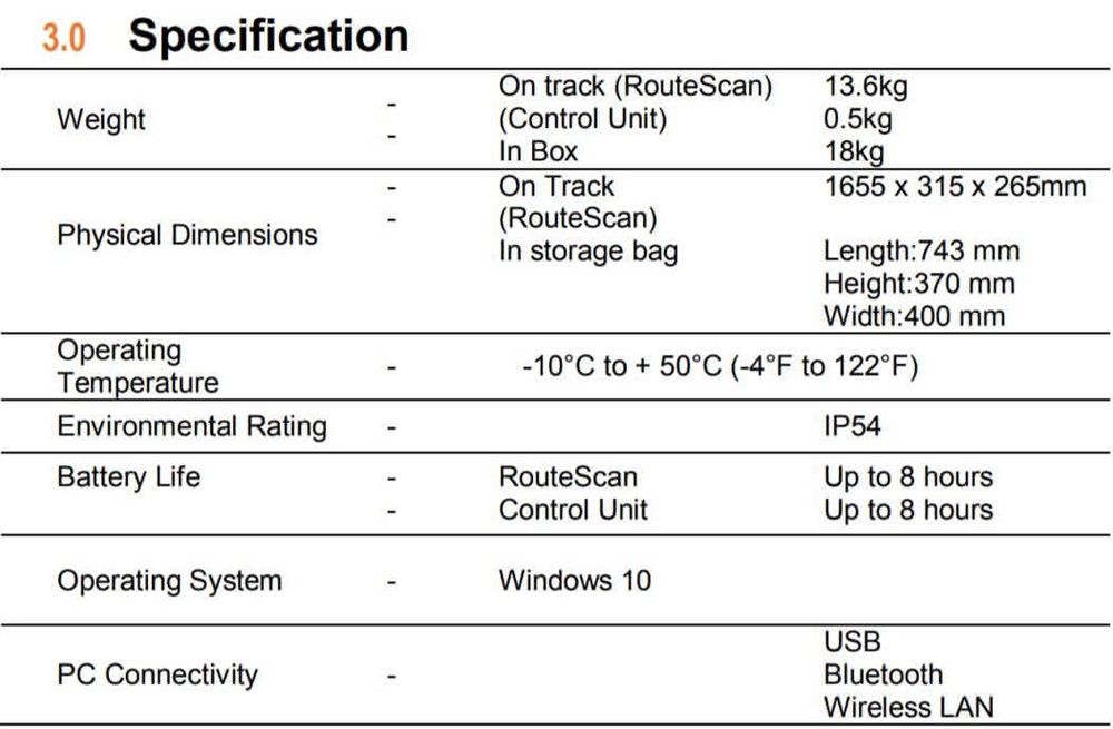 Used by maintenance teams to check tight clearance of tunnels/bridges/platforms. Can be used with a gauging train that measures the network and when it shows a fault, one use the RouteScan to go and verify if there is a problem.