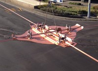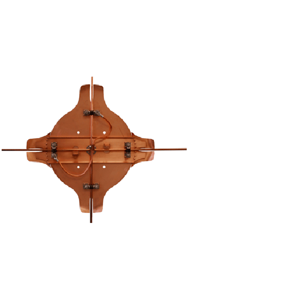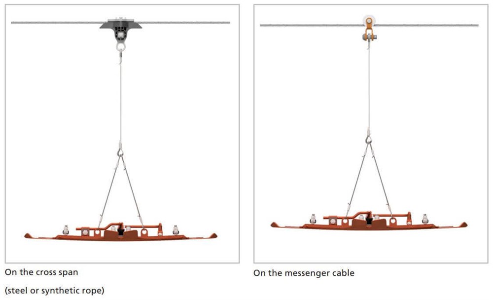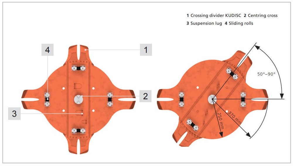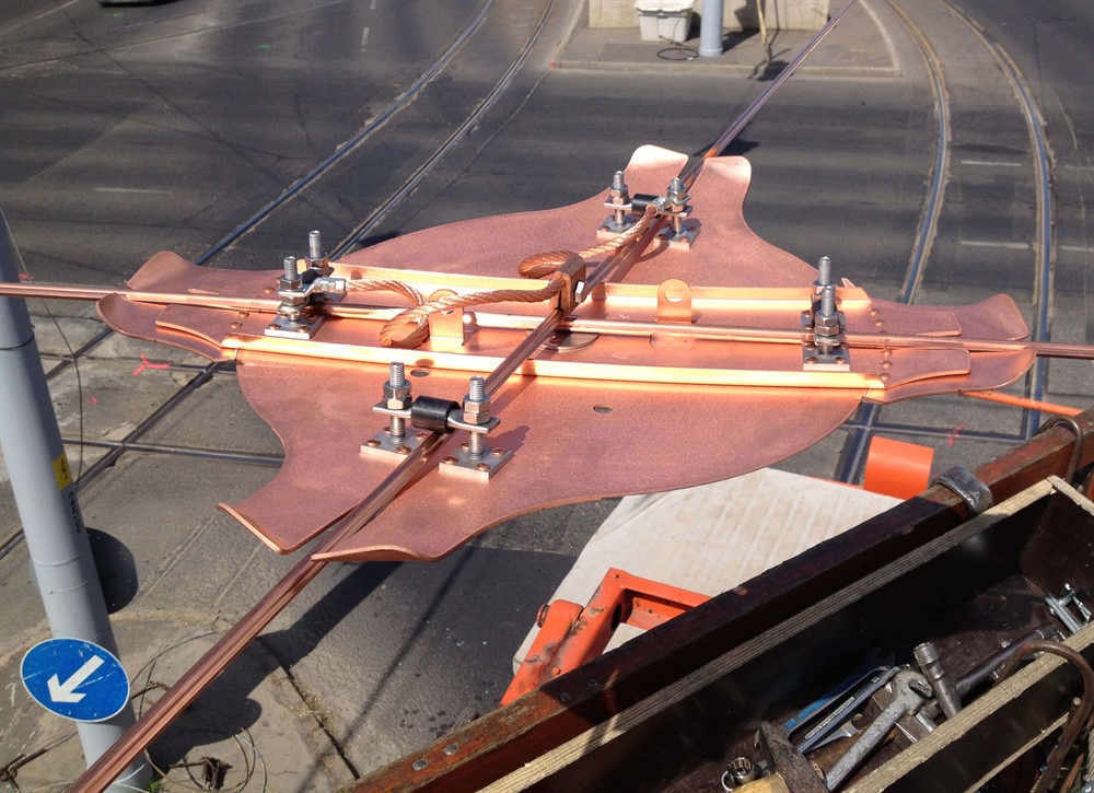 The running surface is made of 100% copper sheet, thereby the electric conductivity is ensured optimal. The trolley wire is kept at the crossing between the plate and the movable cross- pressure rollers, ie the KUDISC does not act as fix point and covers the various requirements of the contact wire systems fixed and auto-tensioned from. Due to the large contact area for the pantograph the wear during crossing is minimized. Crossing TW-TW, adjustable, KUDISC, 55°–90°, for contact wire 100 mm² - 178 mm²