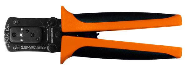 Crimping tool with releaseble locking device for consistently high Crimping quality. The ergonomically formed, soft cushioned 2 components handle guarantees a convenient usage. Intensive round crimping suitable for confined space and thinned conductor terminal.