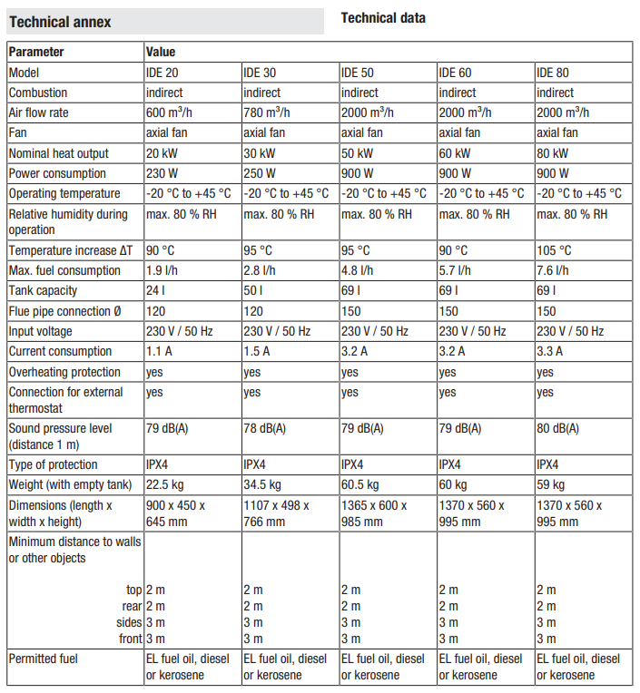 With a powerful heating output of 60 kW and an air flow of 2,000 m³/h, the IDE 60 ensures fast and efficient heating even in demanding environments. It is engineered for operation in ambient temperatures ranging from –20 °C to +45 °C and is equipped with overheat protection, an axial fan, and a connection for an external thermostat to allow precise temperature control.