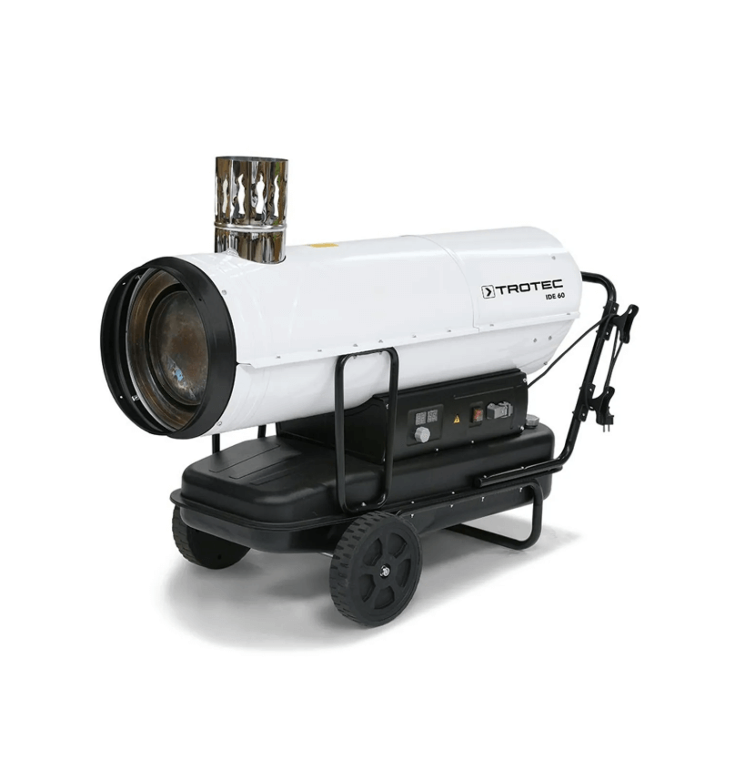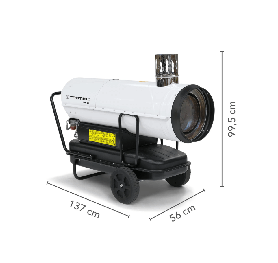 The IDE 60 is a high-performance indirect diesel-fired space heater designed for professional heating of large construction sites, warehouses, workshops, industrial buildings, and temporary structures. Thanks to its indirect combustion system, the heater delivers clean, dry, and fume-free warm air, making it suitable for use in areas where people are present.