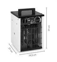 The heater delivers a heating capacity of up to 2 kW and is suitable for rooms up to 25 m² / 60 m³. The continuously adjustable thermostat allows the desired temperature to be set easily, activating the heating elements only when required, while the fan runs continuously to ensure even heat distribution.