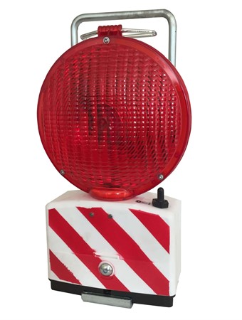 Removable LED lamp with fixed red light, with double-sided red polycarbonate spherical lens with reflector and a battery holder in polyethylene with red and white stripes for greater visibility. It is applied in pairs, mainly in the tail wagon of the goods trains, during the night, to identify with certainty the completeness of the train, that is if it has arrived complete in the next station and in case of failure of the tail lighting system. (CAT. FS 506/003).