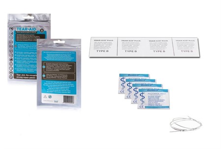 Tear-Aid repairs, among other things: tent cloth, rubber (inflatable) boats, sun and rain screens, jackets and bags.