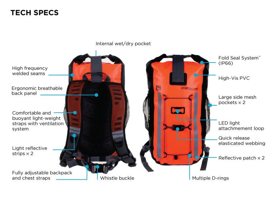 Håll din utrustning torr på vattnet med denna orangea Overboard Pro-Sports vattentäta ryggsäck, med en 100% vattentät rull-top design och ultrareflekterande fält för maximal synlighet.