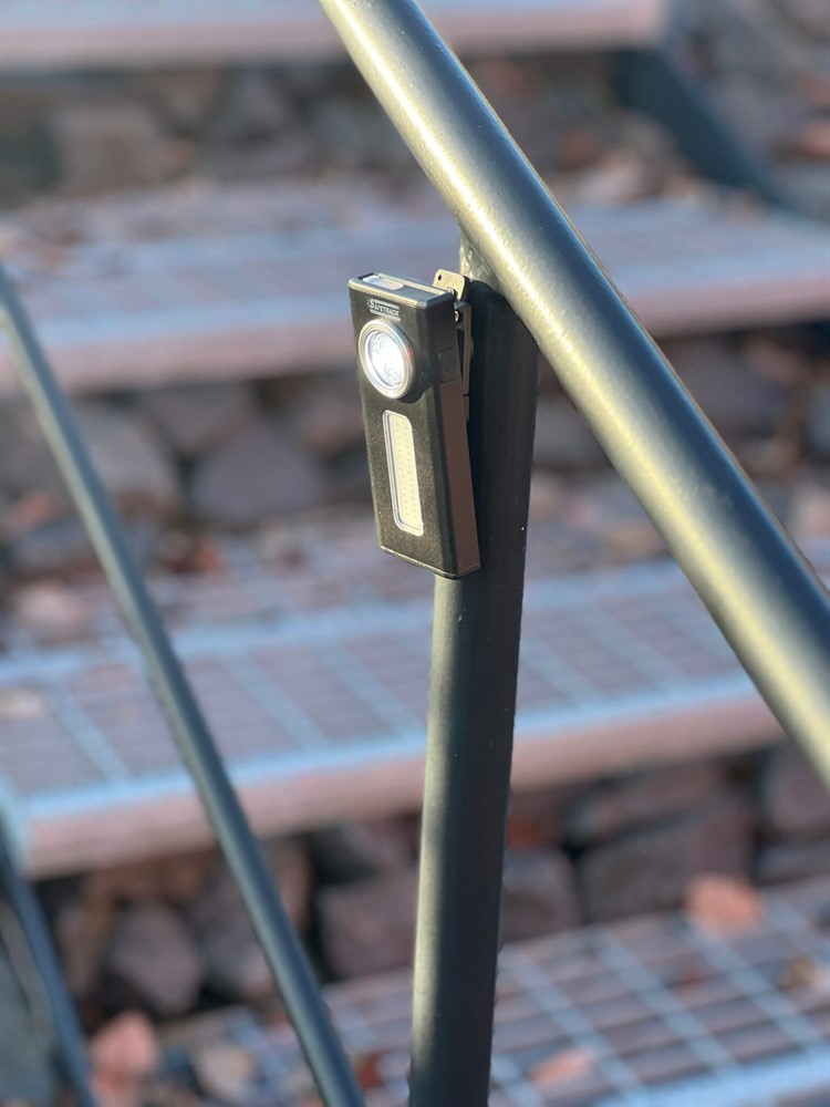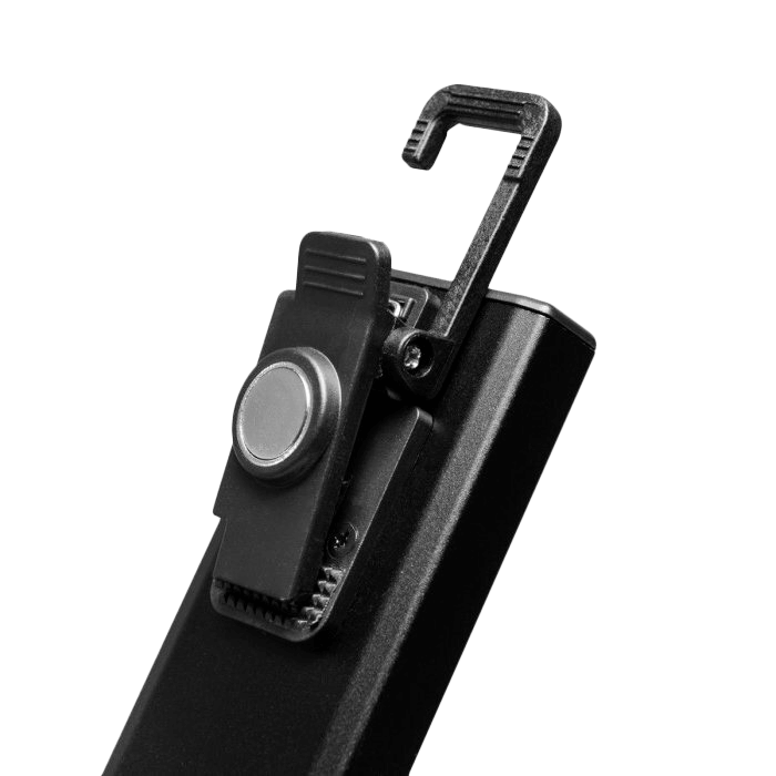 Ficklampan har bältesklipps och kan även hängas med den integrerade kroken eller fästas på metallytor (räls/stolpe/bil) med de inbyggda magneterna placerade på baksidan av höljet, samt i botten på lampan (se extrabilder).