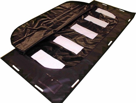 Liksäck för undervattensbruk för Polisens eller Kustbevakningens dykteam, designad med en böjd dragkedja för att kunna användas med eller utan bårstänger. Dragkedjan är låsbar och har dubbla löpare. Klar plastficka för identifieringsetikett - utformad för att läsas från båda sidor utan att ta bort etiketten.